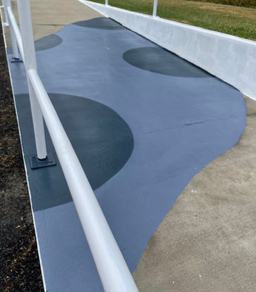 Non-literal, references depict an eco-system of patterns and imagery that reverberate as a place of welcoming. Abstract pathways, stylized landscapes, and concentric patterns, culminate to create a sense of place and mark a gateway for visitors on the river walk to encourage human connection. Hues of soft blues and calm pinks and purples herald the glorious Goondiwindi sunsets as shapes and forms connect the architectural structures of the site. The visual elements harmoniously amalgamate; the corrugated walls of the pump shed, the walkway and railings, and the seat.